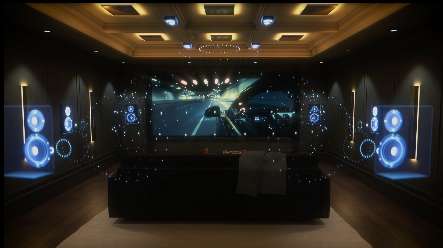 Theatre lighting design featuring dimming zones, step lighting, and programmable scenes tailored for film, sports, and gaming.